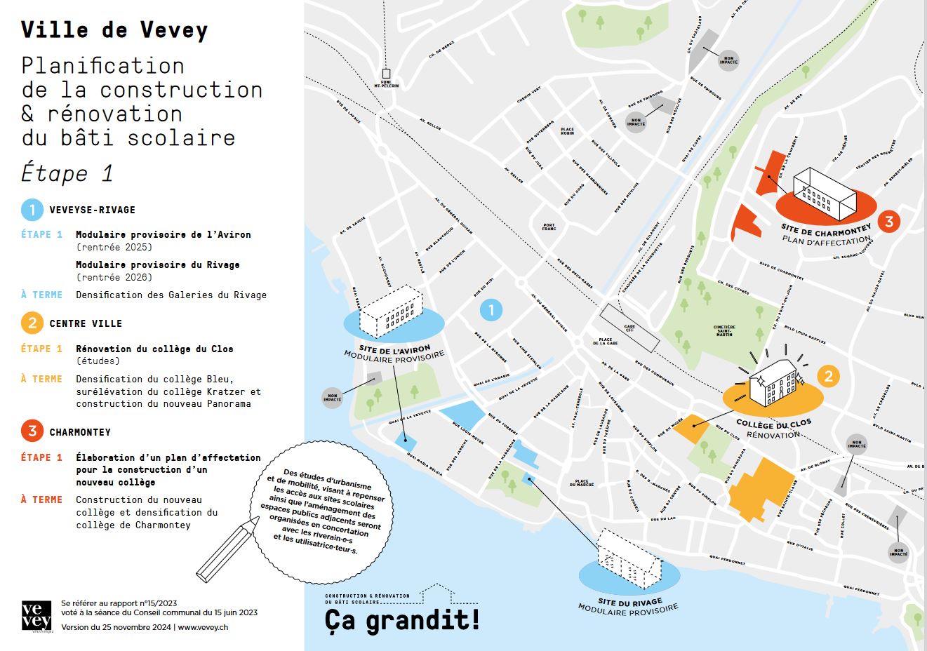 Face à l’absence de terrains disponibles à Vevey et à l’urgence de la situation dans les écoles, le collège exécutif a choisi de réviser son projet afin de déposer une nouvelle proposition pour un collège provisoire au Rivage en 2025.