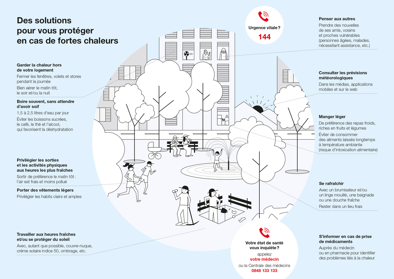 • appeler le médecin traitant ou la centrale des médecins de garde en cas de malaise (0848 133 133) ou le 144 en cas de danger vital.