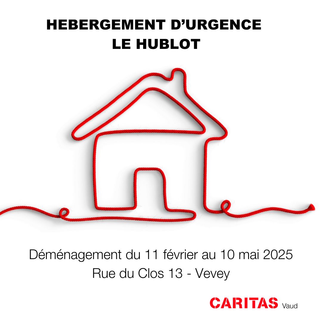 COMMUNIQUE DE PRESSE DE CARITAS VAUD L’hébergement d’urgence « Le Hublot » de Caritas Vaud, situé à Vevey, déménagera temporairement le 11 février prochain dans une infrastructure de la protection civile à la rue du Clos 13. Caritas Vaud, ainsi que les autorités cantonales et communales intensifient leurs efforts pour identifier une solution pérenne avant la mi-mai, afin de garantir la continuité de cette prestation essentielle. Une nouvelle étape transitoire pour le Hublot Une recherche active pour une solution durable Une réponse essentielle face aux besoins croissants Caritas Vaud et ses partenaires restent pleinement mobilisés pour répondre au mieux à cette situation. Caritas Vaud appelle également toutes les parties intéressées, qu’elles soient publiques, privées ou issues de la société civile, à collaborer activement pour trouver un nouveau lieu pouvant accueillir 22 personnes dans la région de la Riviera. Chiffres clés de l’hébergement d’urgence «Le Hublot» :