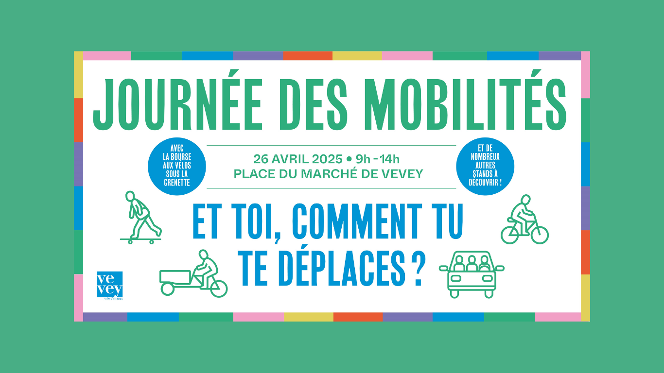 Le samedi 26 avril, la Ville de Vevey, ainsi que des actrices et acteurs locaux œuvrant dans le domaine de la mobilité active, douce et/ou partagée, organisent en partenariat la Journée des mobilités. L'événement se tiendra de 9h à 14h sur la place du Marché, en parallèle de la bourse aux vélos.