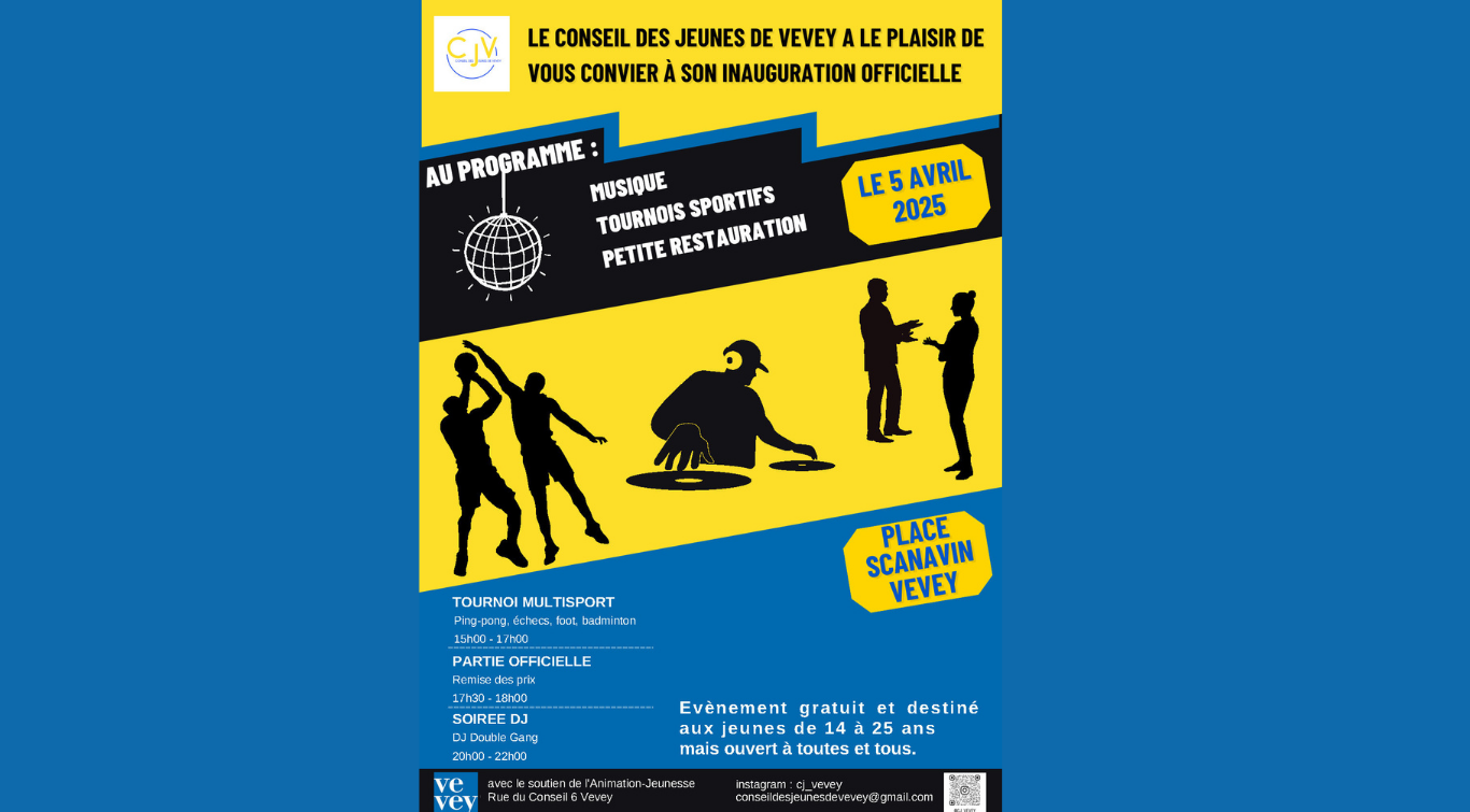 Le samedi 5 avril 2025, aura lieu l’inauguration officielle du Conseil des Jeunes de Vevey. Cet évènement convivial se déroulera de 15h à 22h sur la Place Scanavin avec au programme : tournois multisport, animation musicale et apéritif dînatoire. Partie officielle à 17h30 et remise des prix.