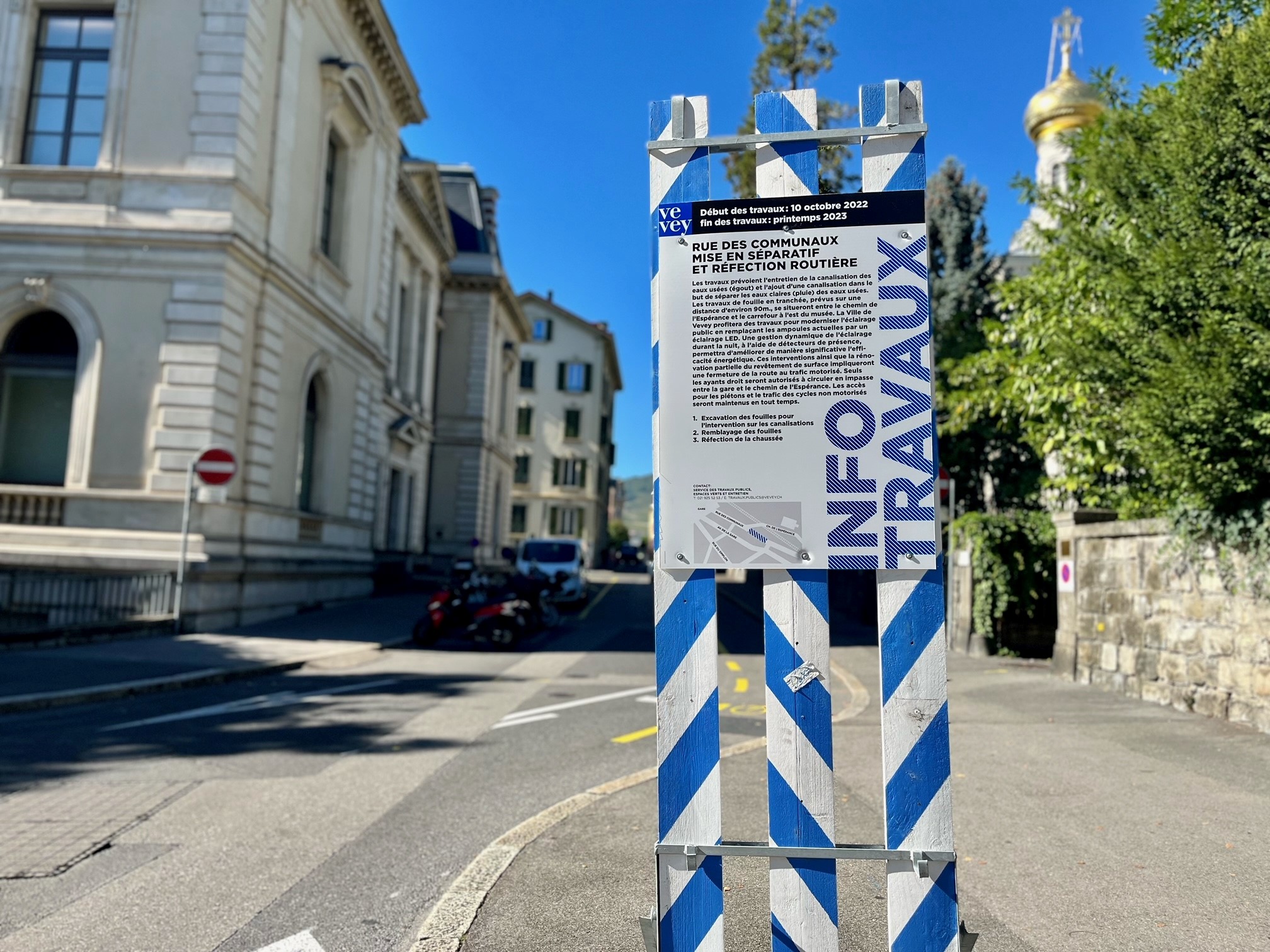 Le tronçon de la rue des Communaux situé entre le chemin de l’Espérance et le carrefour à l’est du Musée Jenisch fera peau neuve ces prochains mois. Les travaux qui débuteront lundi 10 octobre prochain prévoient l’entretien de la canalisation des eaux usées et l’ajout d’une canalisation pour les eaux claires. La Ville de Vevey profitera de ce chantier pour moderniser l’éclairage public en remplaçant les ampoules actuelles par des ampoules LED. Des détecteurs de présence seront également installés afin de réduire fortement l’éclairage et la pollution lumineuse durant la nuit. Ces rénovations permettront d’améliorer de façon significative l’efficacité énergétique. La fin des travaux est prévue au printemps 2023.