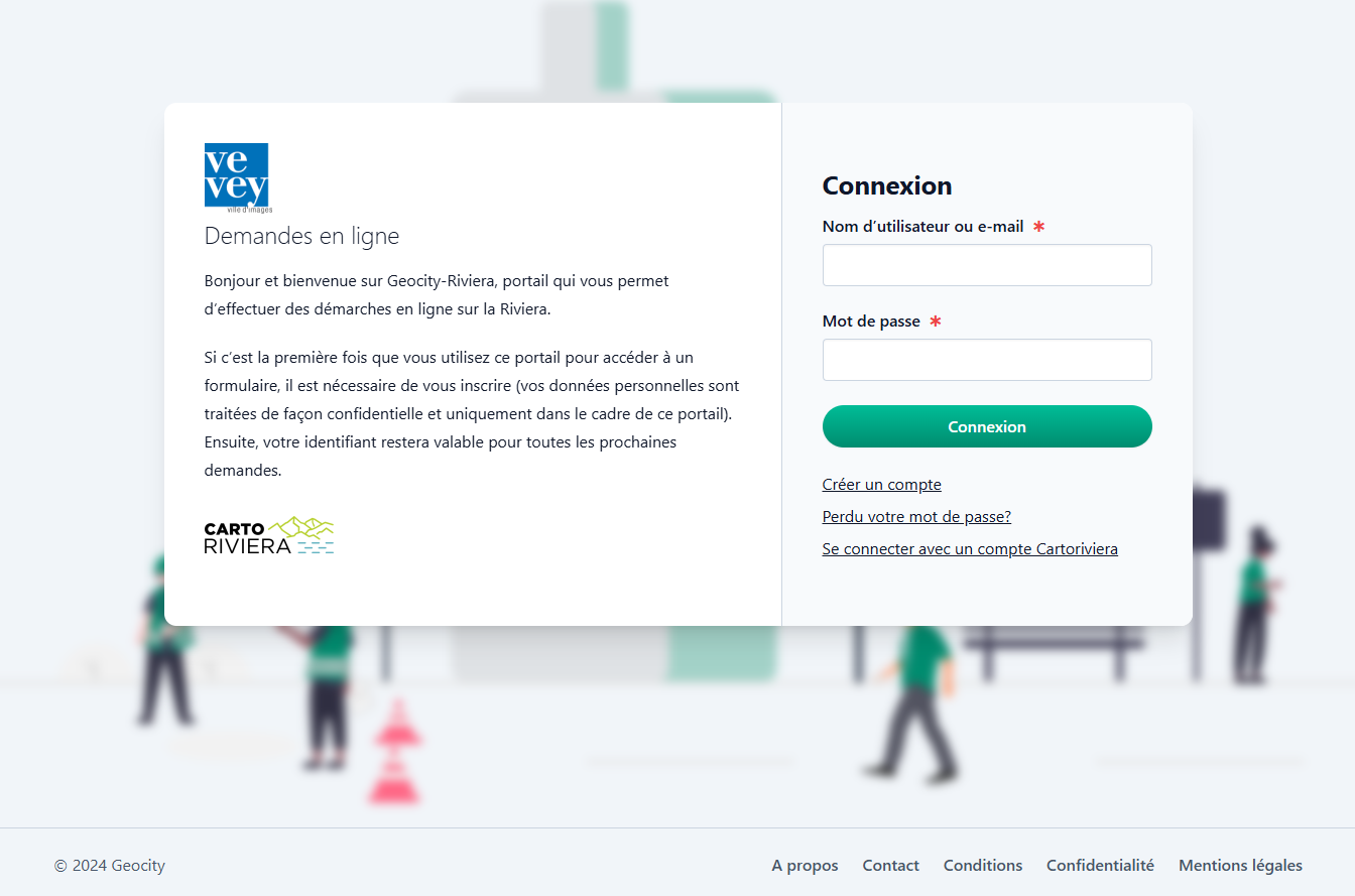 Les propriétaires ou les mandataires peuvent désormais, moyennant la création d’un compte personnel, effectuer leurs demandes à l'aide du logiciel de cyberadministration « Geocity-Riviera », mis à disposition par le géoportail régional Cartoriviera : https://www.vevey.ch/prestations/travaux-de-minime-importance.