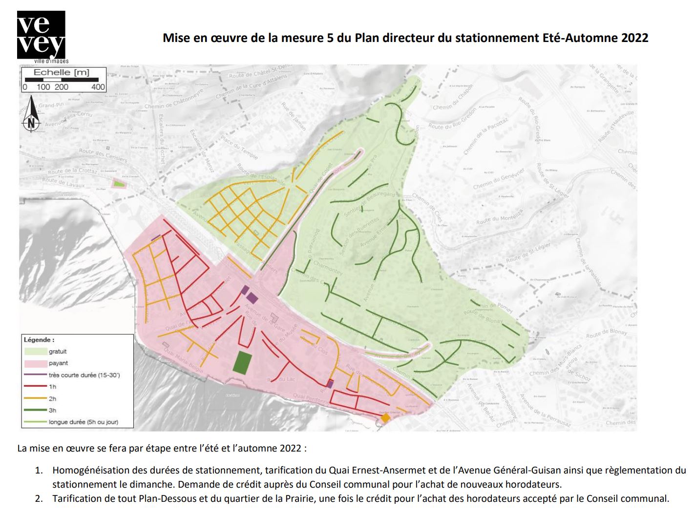 - Règlementation du stationnement le dimanche au sud des voies CFF L’ensemble des places de stationnement public en surface est actuellement gratuit et sans limitation de durée le dimanche. Cette situation génère des flux de trafic importants ce jour-là, en particulier à proximité des rives du lac, ainsi que du stationnement hors case, notamment sur la partie réservée aux piétons de la place du Marché. La Municipalité a par conséquent décidé de réglementer et tarifier toutes les places de stationnement public en surface situées au sud des voies CFF, au même prix que les autres jours de la semaine. L’objectif est d’inciter les automobilistes à utiliser les 1’043 places de parc situées dans les différents parkings souterrains accessibles au public de la commune qui sont actuellement sous-utilisés les dimanches. L’heure de stationnement y sera facturée 1fr., y compris dans le parking Vieille Ville, contre 2 fr. pour une place en surface.