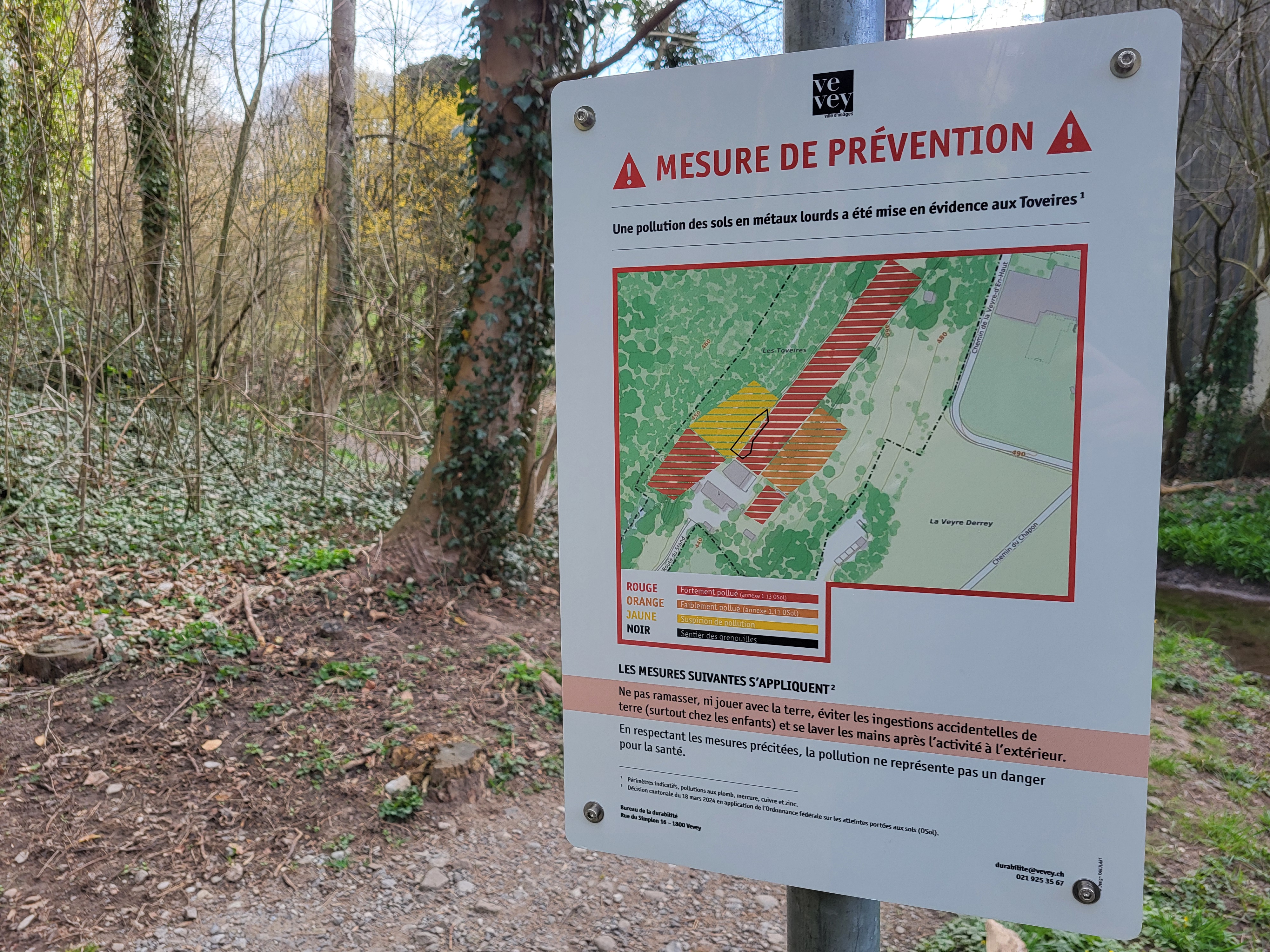 Plusieurs zones de la parcelle des Toveires sont polluées par des métaux lourds. Cette pollution ne représente pas de danger pour la population, dans la mesure où cette dernière s’abstient de ramasser, de jouer ou d’ingérer la terre. Des panneaux d’information ont été installés pour avertir les promeneuses et promeneurs.