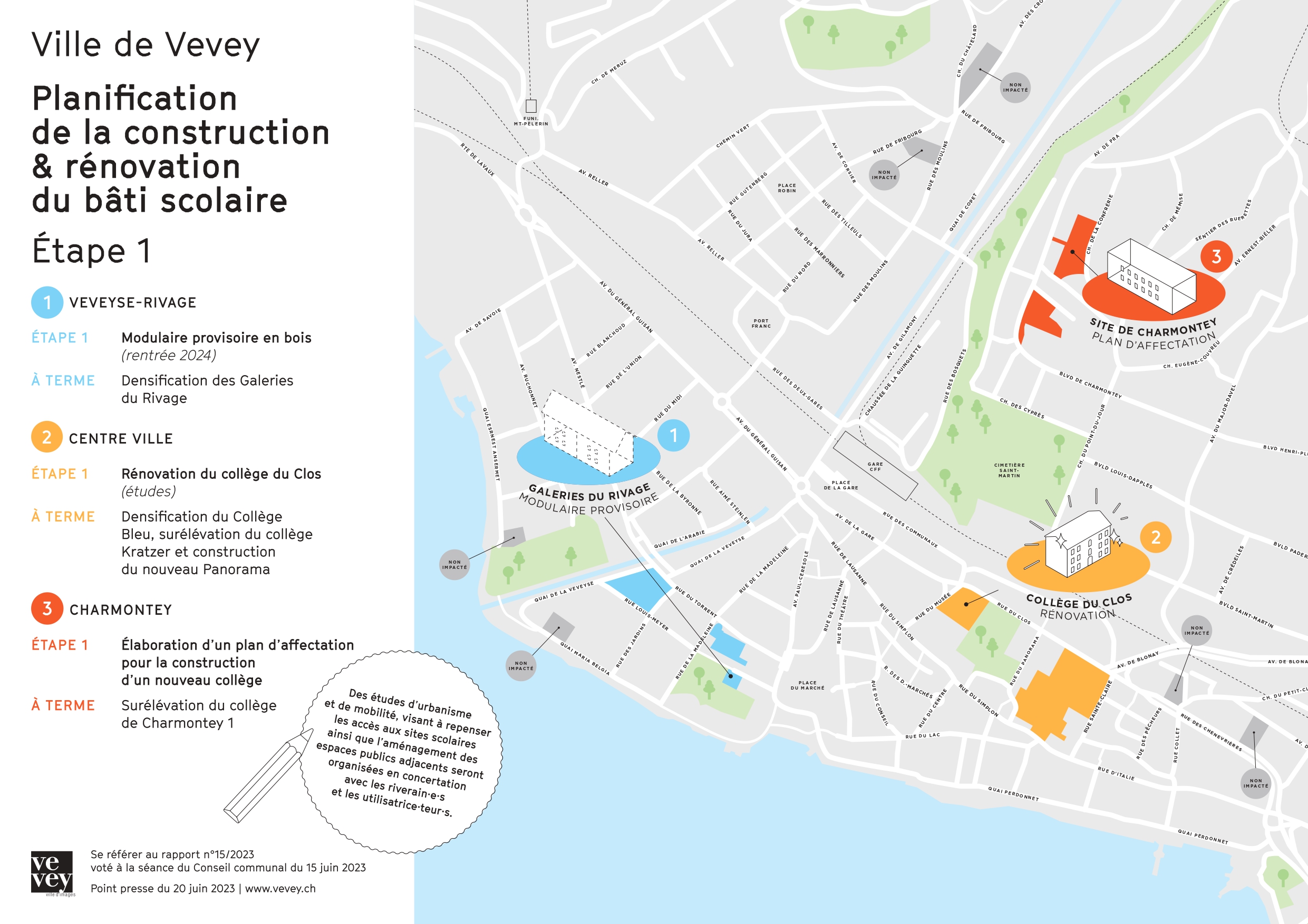 La mise à l’enquête pour la construction d’un collège modulaire en bois aux Galeries du Rivage pour une durée évaluée à 10 ans démarrera courant juillet, en vue d’accueillir des élèves et leurs enseignantes et enseignants à la rentrée 2024. Il offrira environ dix-sept salles d’enseignement qui serviront durant les dix prochaines années, c’est- à- dire jusqu’à la fin des travaux de rénovation et d’extension des autres bâtiments. Une séance d’information publique est organisée le mercredi 12 juillet 2023, à la salle del Castillo.