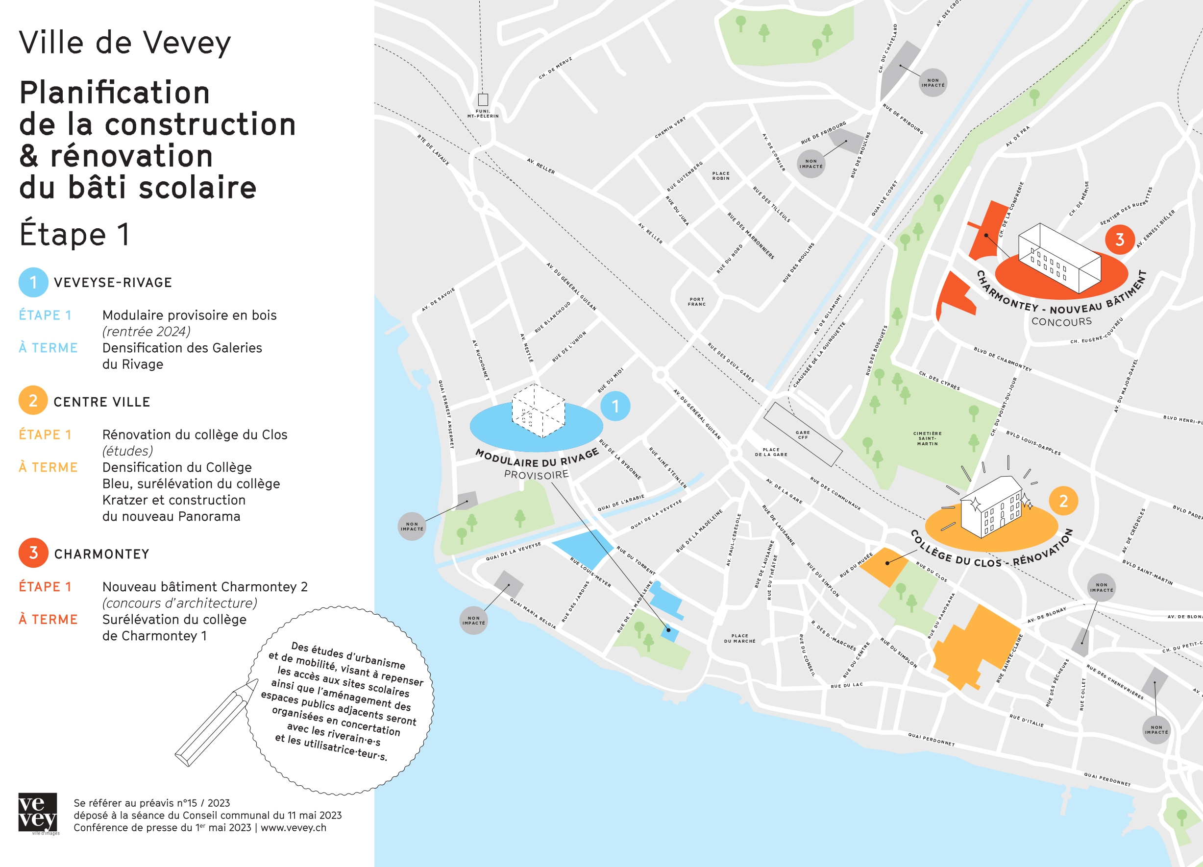 Pour répondre à l’évolution du nombre d’élèves et offrir un environnement scolaire de qualité, la Ville de Vevey prévoit de construire, d’ici à 2032, 30 classes supplémentaires. Une série d’études préliminaires est en cours pour planifier les projets de rénovation, d’agrandissement de l’existant et de construction de nouveaux bâtiments provisoires et définitifs. Le 15 juin, le Conseil communal votera sur un crédit d’études, qui permettra de mettre sur les rails trois projets prioritaires.