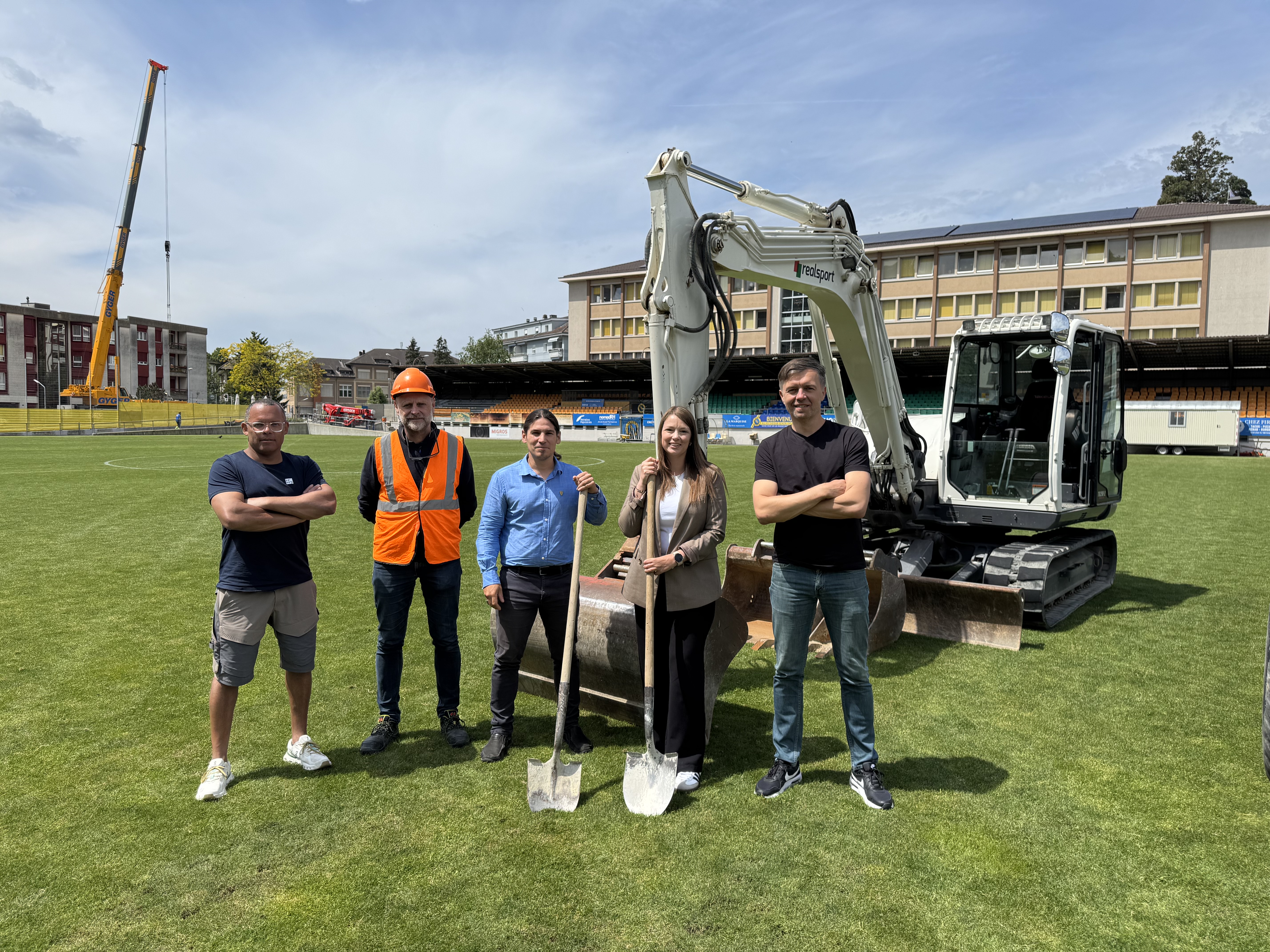 Coup d'envoi du chantier de rénovation du terrain de Copet 1. De g. à d. : Olivier Ruedin, Répondant des installations sportives Ville de Vevey, Romain Heckler, bureau « idsport ingénierie & conseils SA » mandataire pour le projet de rénovation de Copet 1, Pascal Molliat, municipal du Service bâtiments, gérance et énergie, Laurie Willommet, municipale du Service famille, éducation et sport et Piotr Wiacek, responsable du Secteur sport