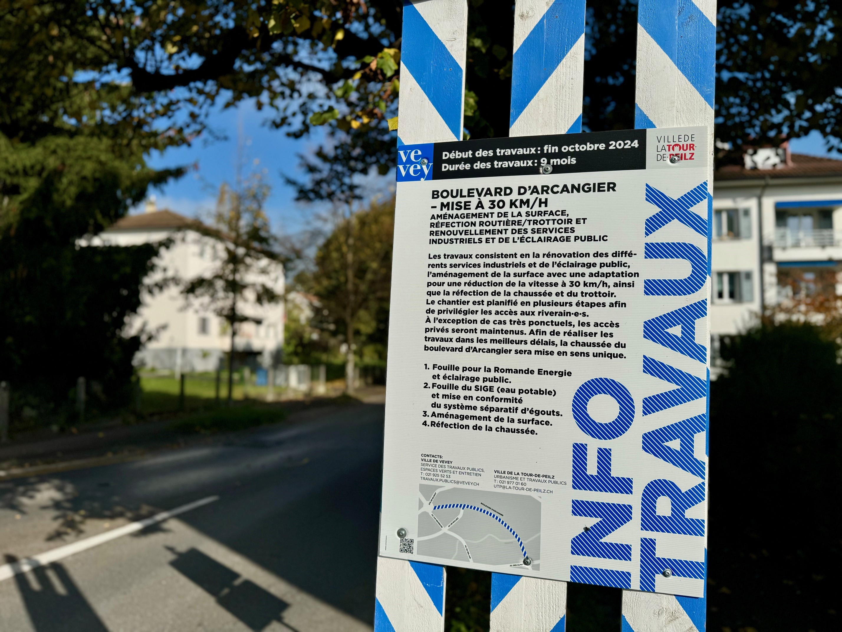 Les travaux d’aménagement ont débuté ce lundi et devraient durer neuf mois. Ils incluent la rénovation des services industriels et de l’éclairage public, ainsi que la réfection de la chaussée et des trottoirs. Le chantier se déroulera en plusieurs étapes et, durant les travaux, le boulevard sera mis en sens unique Vevey -> La Tour-de-Peilz dès le 4 novembre.
