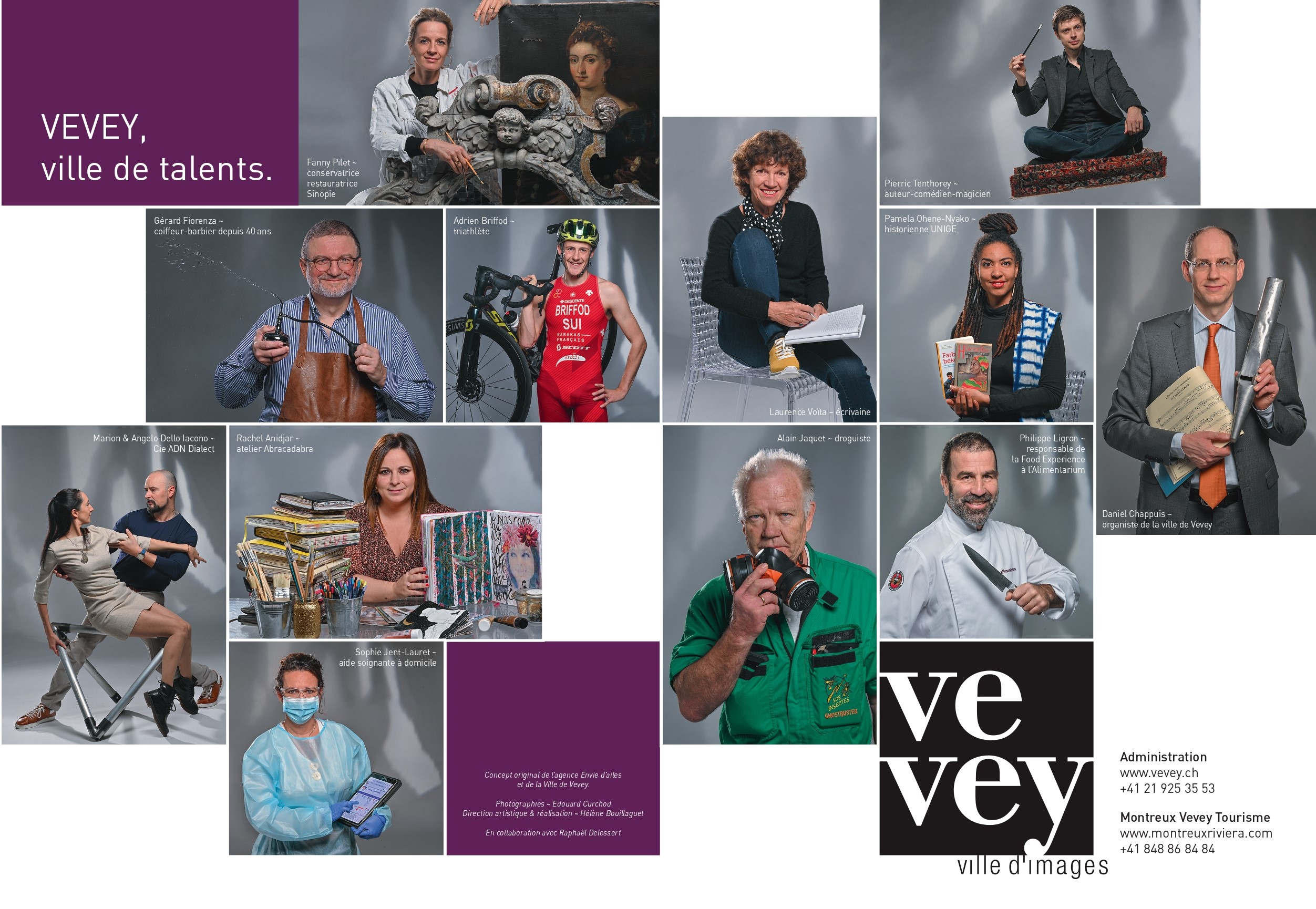Pour la neuvième année consécutive, la ville d’images met en lumière celles et ceux qui participent à son rayonnement au quotidien. Le visuel officiel de Vevey réunit ainsi en 2021 le magicien Pierric Tenthorey, le cuisinier Philippe Ligron ou l’historienne et figure de l’afro-féminisme Pamela Ohene-Nyako.