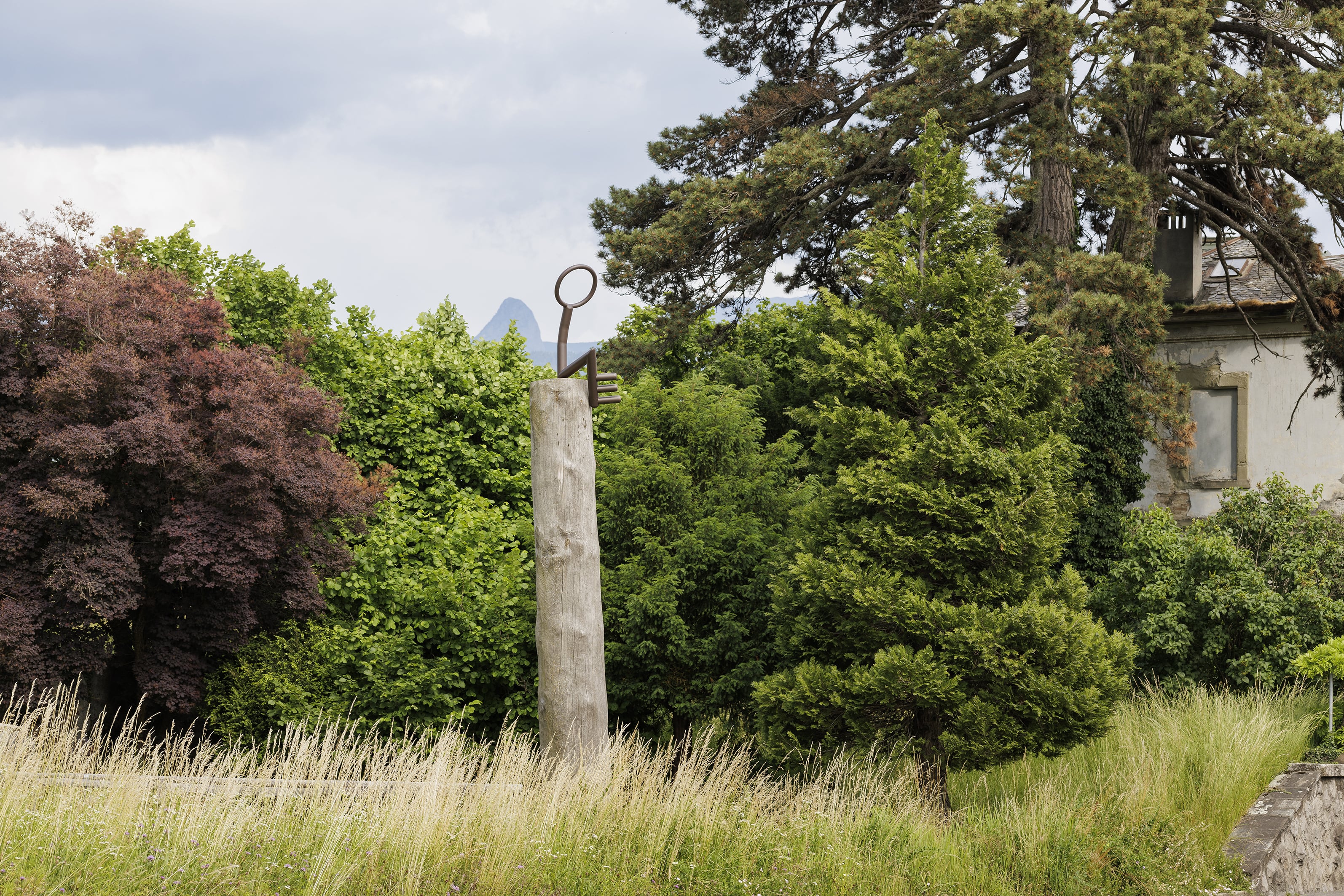 Pour réaliser cette clé de métal peint, l’artiste s’est inspiré des clés celtes de la collection Jean-Josef Brunner, qui se trouvent au Musée historique de la Ville de Vevey. Constituée de tubes métalliques et traitée pour être désormais durablement résistante aux intempéries, elle a été produite à la forge de Chexbres.