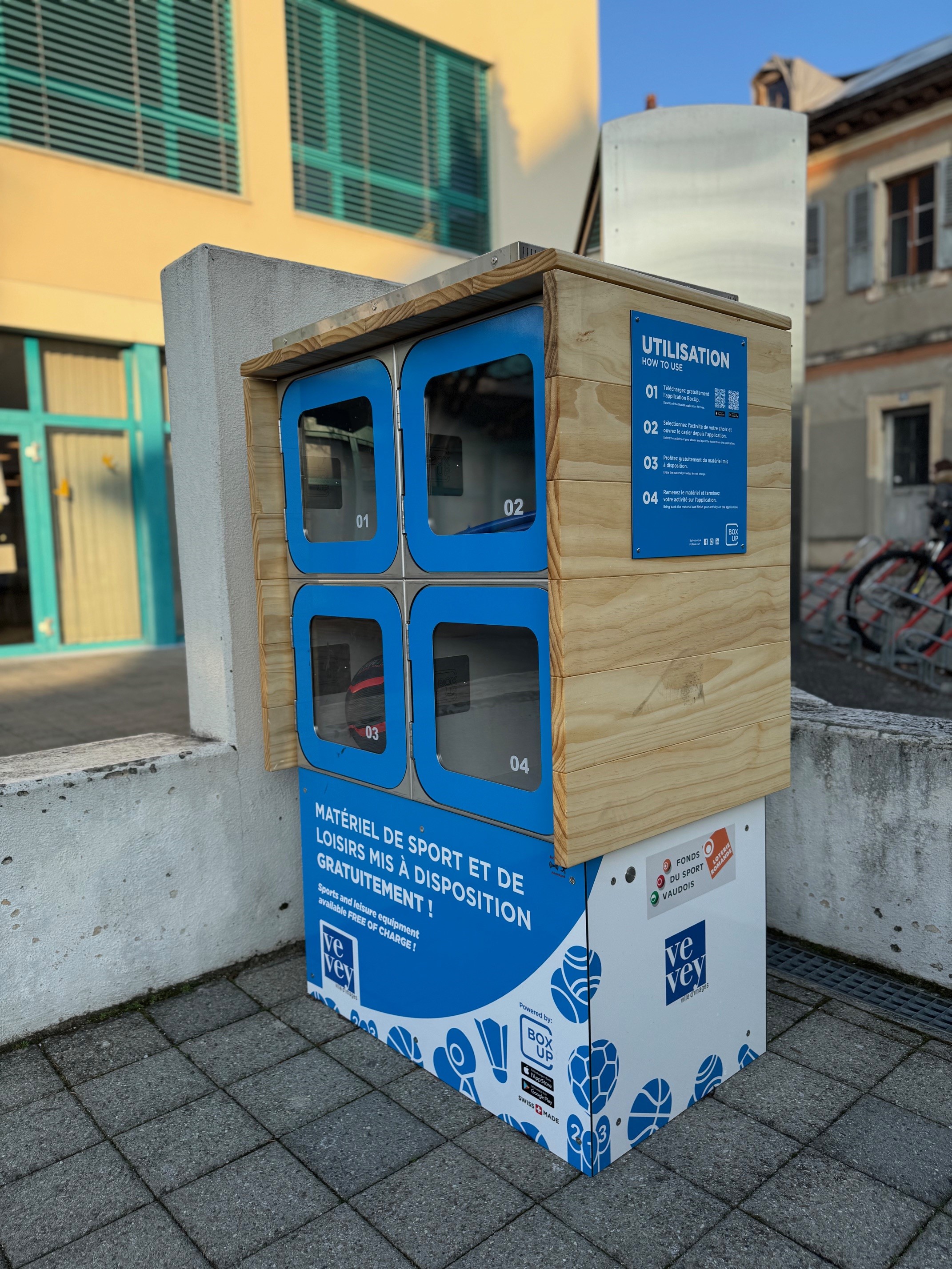 Tous les produits sont conçus avec des partenaires locaux dans une optique de durabilité. La structure abritant les casiers est alimentée par un panneau solaire. A noter, que la Ville de Vevey est l’une des premières villes à bénéficier d’une subvention de la Fondation « Fonds du Sport Vaudois » pour ce genre de structures.