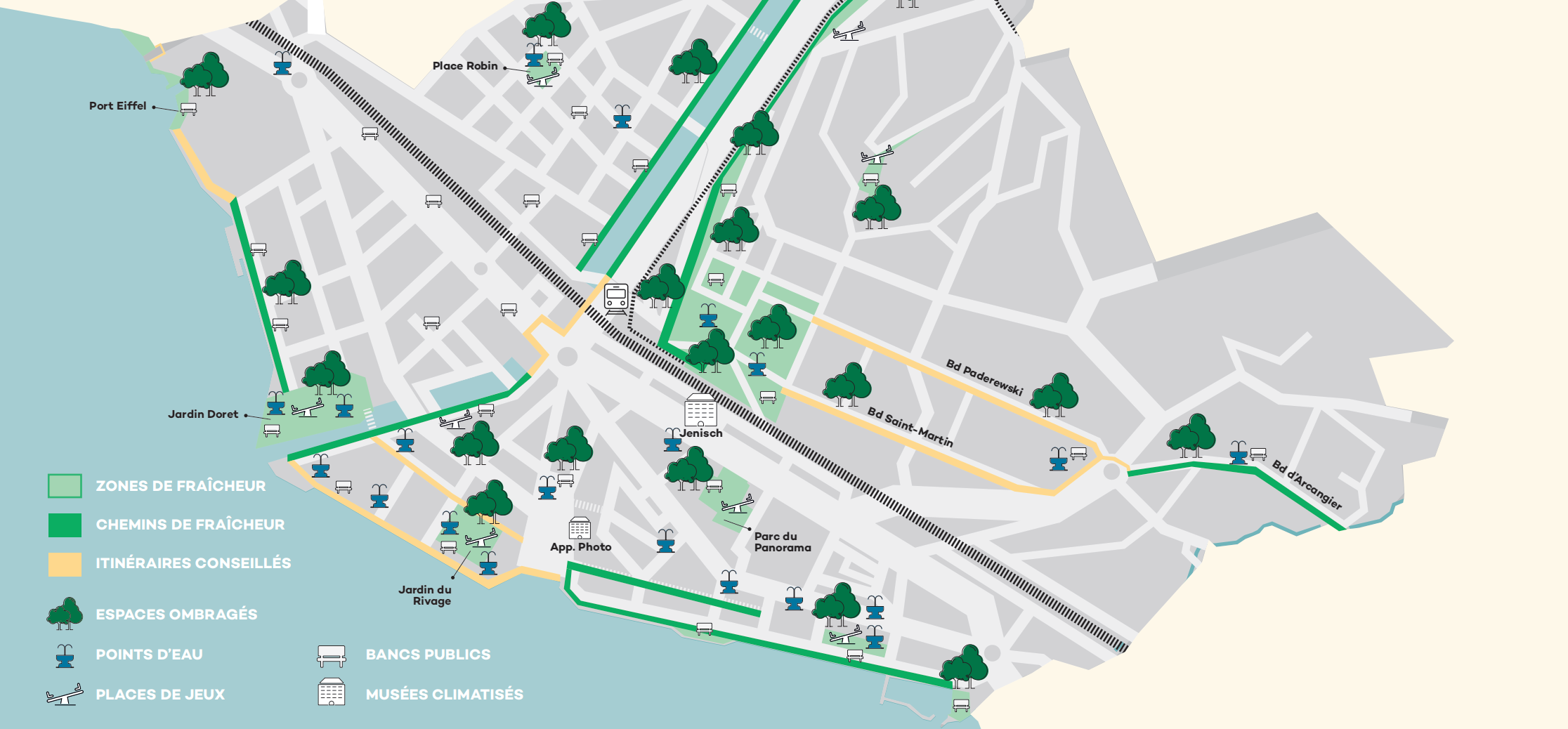 Cette carte recense des itinéraires et des lieux où la température est moins chaude. Elle met en évidence des parcours ombragés, des espaces verts, des points d’eau ainsi que des endroits propices à une pause.